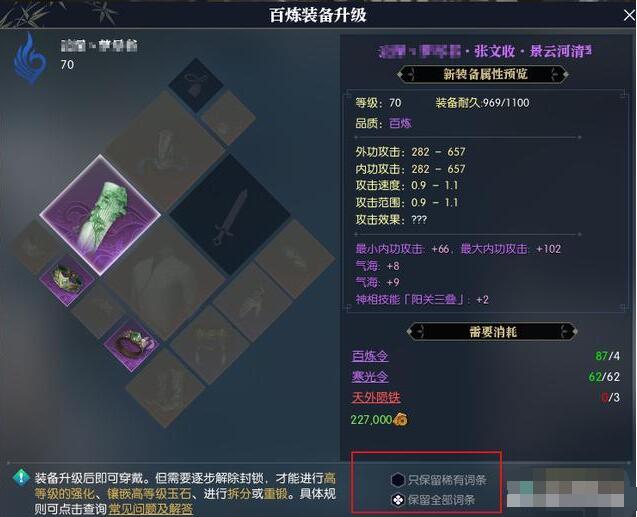 逆水寒迎来了新资料片后的第一次更新,原本期待的新副本依旧没有上线。除了新外观,游戏还开放了一个新功能,那就是60百炼装备升级70百炼。60百炼装备升级为70百炼有两种选择,一种是只保留稀有词条,一种是无损升级。无损升级的消耗自然比第一种选择要多,需要消耗到寒光令,百炼令和天外陨铁!