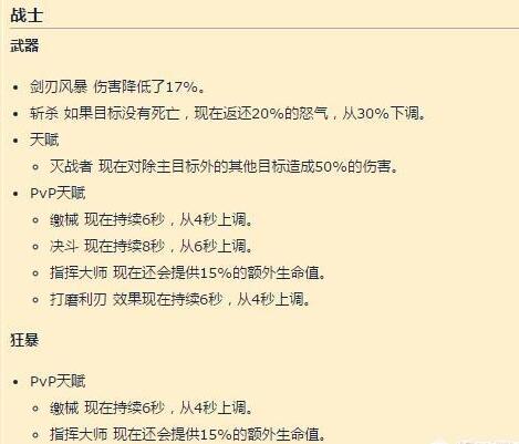 从这张图中我们可以看到,武器战的剑刃风暴伤害降低了17%,斩杀的怒气返还也从30%下调到了20%,也就是说,武器战在PVE方面得到了极大的削弱。不过,在PVP方面武器战得到了加强,各种持续时间和回复都有了明显的上涨。