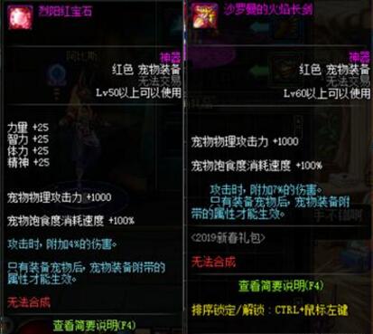 我们将周常地下城里面的装备和2019年春节礼包中的宠物装备做一个对比,周常地下城里面的红色宠物装备比春节礼包中的宠物装备多了25的四维,但是少了3%的白字。就伤害而言还是春节礼包中的红色宠物装备伤害要高。