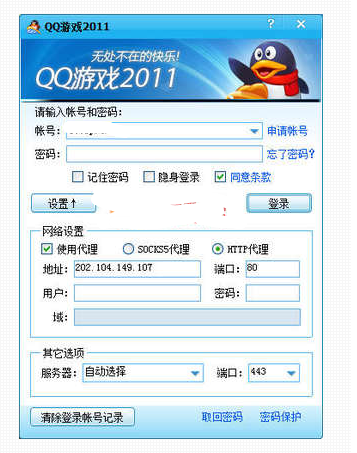首先运行qq游戏客户端,在弹出的登录会话框中,点击设置,会出现下拉选项,里面有加速器的设置选项,勾选“使用加速器”,然后再点选http加速器,在下面的空白框里填入ip地址和端口,用户和密码不用填写,其他默认,然后再输入您的游戏账号密码就可以登录了 。