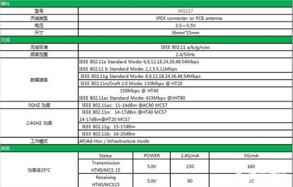 在手机用WIFI上网时,我们所用的2.4G和5G哪个耗电多,这个得根据境你身处的环境有很大关系。WiFi模块的功耗其实跟模块的功率挂钩的,在功率值一样的环境下,通信环境干净的情况下,5G WiFi和2.4G WiFi的功耗值是差不多的。下图是SKYLAB 2.4/5g双频ac usb WiFi模可罣217的基本参数: