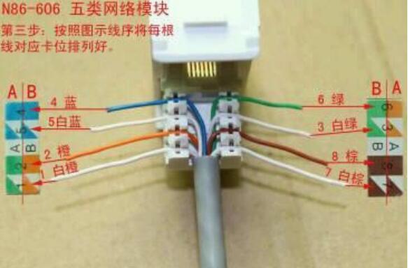 1橙白、2橙,3绿白、4蓝,5蓝白、6绿,7棕白、8棕 (568B),千兆网线插座接法 按照插座的提示B类接法,值得一提的是 八根线都要接通才能实现千兆,一定一定要注意。只要用一个二三十的测线仪就可以测试网线是不是都接通。值得一提的是败家之眼是华硕目前最高端一款路由了,路由器如果是豪华跑车的话,家里的网线、插座、水晶头之类的就是公路,路修的不好,跑车再好速度也提不上去。