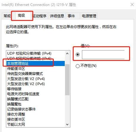 4.在“属性”窗口,点击“高级”菜单中的“本地管理地址”;