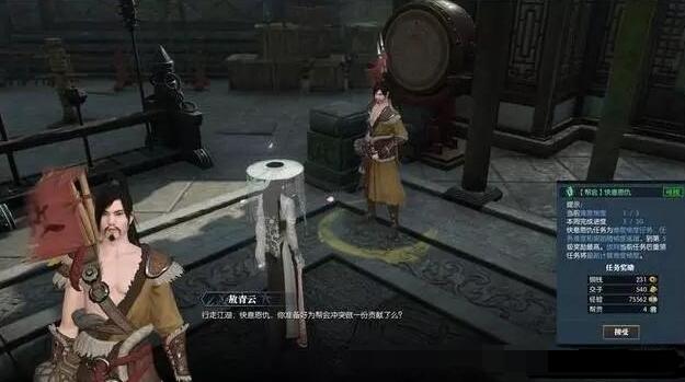 帮贡的获取!①.通过个人任务(仗剑江湖,广厦同袍,快意恩仇,混江湖,传功) 和帮会活动(雄途霸业,迷天卷土,一场醉,三合楼,帮会联赛),都可获得帮贡奖励。我说说快意恩仇,快意恩仇每周可以打十次,五次算一轮,一轮可以拿到30贡献。费时30分钟能刷完。②.帮派有一个任务是倒买倒卖就是跑商。看着屏幕旁边的提醒,低价地方买入,跑到高价地方卖出。这个任务跑一次是给你60多的贡献。③.最肥的帮贡任务,找凉姨一个女的npc。每周你可以去刷30次左右。每次奖和快意恩仇差不多。