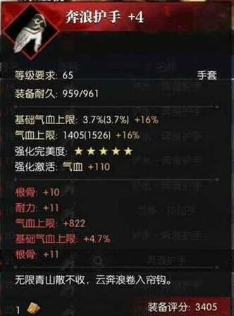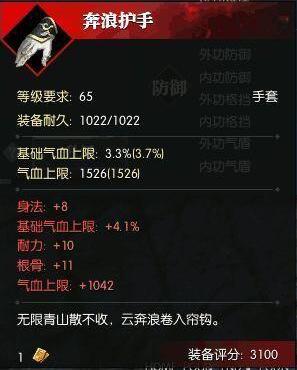 再来看看网友700元买到的类似的护手!该护手是网友700元买到的类似的护手,属性加成为:身法+8,基础气血上限+4.1%,耐力+10,根骨+11,气血上限+1042!同样是五词条极品,但是当中却是有一个占用词条,就是身法!大家都知道这个身法是最难掉的,如果想要打造出跟上面类似于王校长2万块买的那样的词条,那最后花费的可能就不止2万了,也可有可能几千就搞定,完全是看脸!